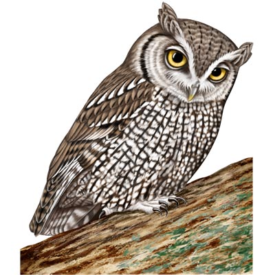 Screech-owls are typical owls (Strigidae) belonging to the genus Megascops. Twenty-one living species are known at present, but new ones are frequently recognized and unknown ones are still being discovered on a regular basis, especially in the Andes. Screech-owls hunt from perches in semi-open landscapes. They prefer areas which contain old trees with hollows; these are home to their prey which includes insects, reptiles, small mammals such as bats and mice and other small birds. Screech-owls have a good sense of hearing which helps them locate their prey in any habitat.