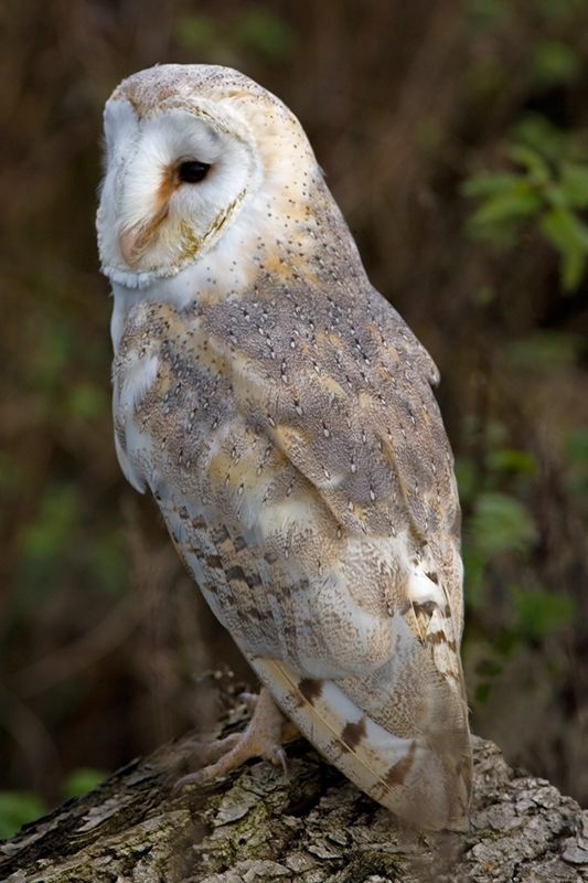 Both male and female barn owls have a speckled, reddish-brown body and white, heart-shaped face. While the male’s chest is predominantly white, the female’s chest is darker and heavily spotted. The species can approach 18 inches in height, with females being slightly larger than males.