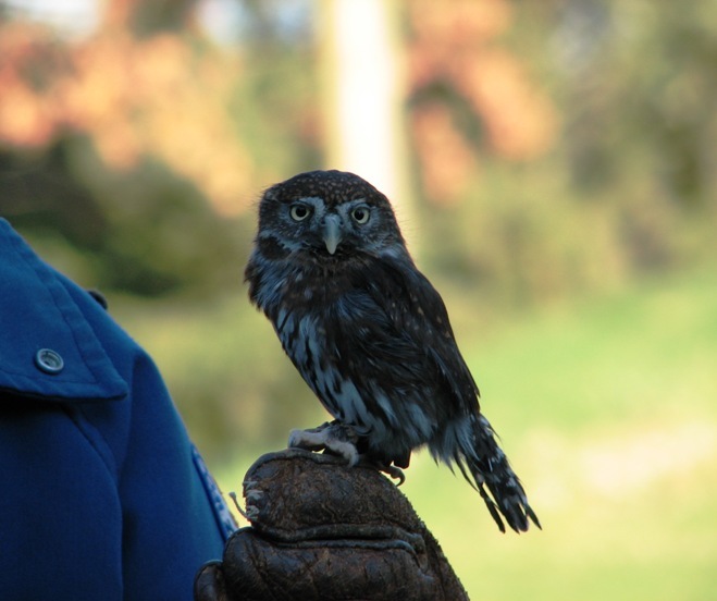 The Elf Owl (Micrathene whitneyi) is a member of the owl family Strigidae that breeds in the southwestern United States and Mexico. It is the world's second smallest owl, the first being a Pygmy owl. They are 5-12 inches tall and have a wingspan of 15-16 inches and short tails. Their primary projection extends nearly past their tail. They have fairly long legs and often appear bow-legged. They are 1-1.4 ounces.They can often be heard just after dusk or at sunset, calling to each other. Their call is a high pitched whinny or chuckle. The male and female dart around the trees and call back and forth.